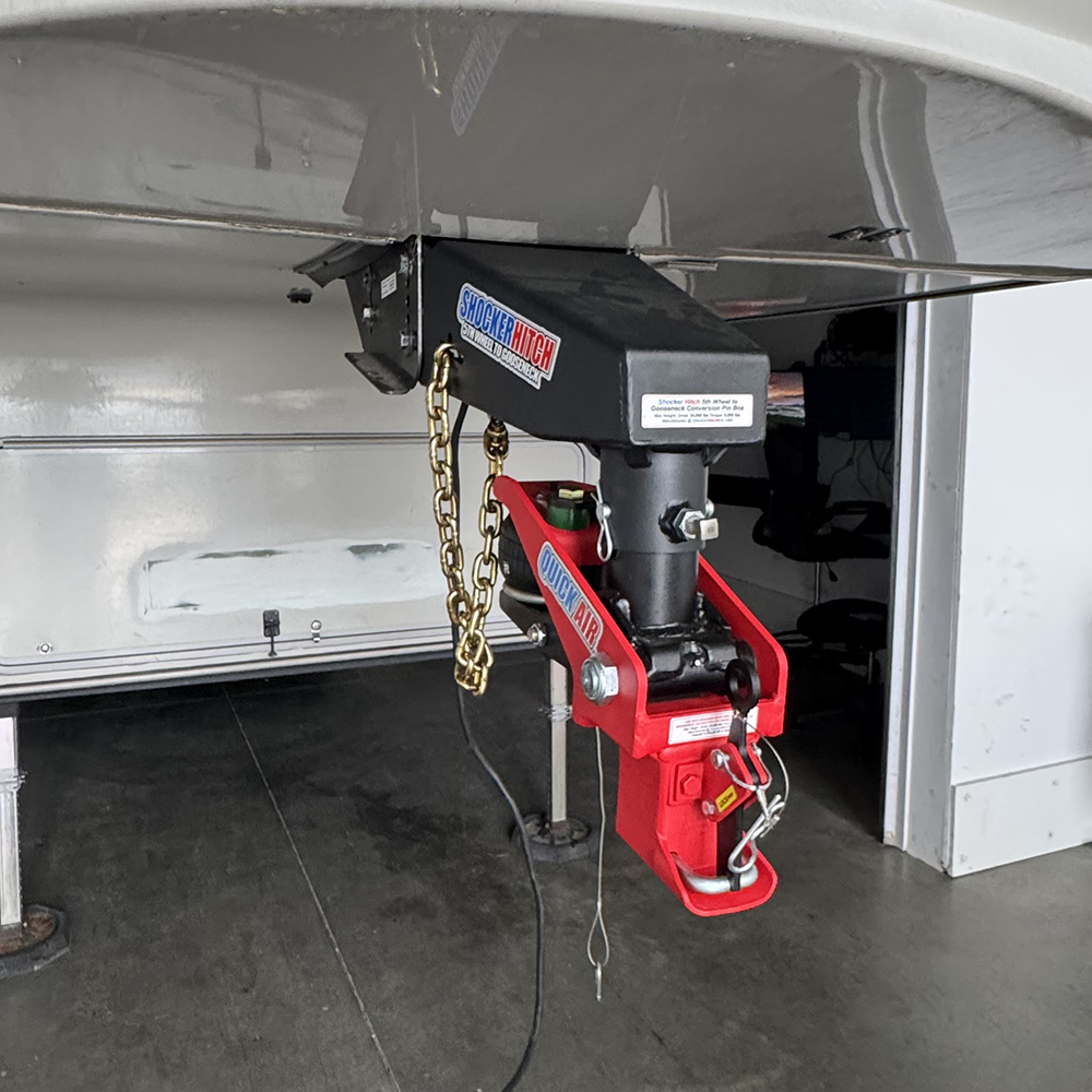 Air ride upgrade for 5th wheel camper trailers. Quick Air 5th Wheel to Gooseneck conversion kit. Experience safer, smoother towing. Upgrade your 5th-wheel camper with a gooseneck pin box and Shocker Quick Air® gooseneck air hitch and shift lock gooseneck coupler. This 5th to goose conversion kit comes complete with a heavy-duty steel replacement gooseneck pin box along with a complete Shocker gooseneck air hitch with shift lock coupler for a 2-5/16″ gooseneck ball. Get smoother safer towing along with faster hookups and disconnects with the Shocker Quick Air® 5th wheel to gooseneck conversion kit. The built-in air ride system cushions your truck and camper and absorbs the road shock giving you a much nicer towing experience. This rv gooseneck adapter is sure to make your next trip smoother, plus it reduces damage on your camper frame and contents. You can easily adjust the air pressure for when your camper is loaded or unloaded for the best ride and load control. Featuring up to 6,000 lbs of tongue weight and 24,000 lbs of gross trailer weight. The patented and Shocker Gooseneck Surge® air hitch & patented Shift Lock® coupler is the ultimate in gooseneck trailer towing for your rv camper. This shock-absorbing cushion hitch is the only air ride hitch to exclusively work in a forward and back motion, which is oftentimes this is the biggest jerk you feel when towing your 5th wheel rv camper trailer. The built-in air ride system absorbs the road shock and filters the bumps through the air ride system creating a smoother, safer towing experience for you, your pickup, your fifth wheel trailer & the contents. Replaces the need for bulky in truck bed 5th wheel sliders. The 5th wheel to gooseneck adapter is simply to install. Featuring the patented revolutionary 24K Shift Lock® Coupler for 2-5/16″ gooseneck ball. Whether you are an occasionally tow or are going camping all over the country, this 5th wheel to gooseneck system adds instant air ride to your towing. Gooseneck pin box available for these 5th wheel campers with Lippert 1621, 0719 or Rhino Box, as well as the Lippert 1716, 1116, 0115, FabEx 500, 503, 520, 530, 560 & RBW 7028. We also have one for the turning point pin box. Choose with or without safety chain kit. A safety chains are required with gooseneck hitch towing.