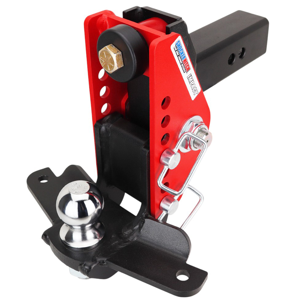 This Impact Shocker raised cushion hitch with sway bar tabs has a dual bump cushion design for cushioning and absorbing the road shock when your towing. The Impact raised cushion bumper hitch features 7 adjustment holes for up to 5″ of rise and 3″ of drop. The raised hitch option was designed for pulling campers with higher trailer tongues or lower than stock trucks. To help eliminate any of the unwanted sway issues, this mount has welded sway bar tabs that work with the Shocker 17200 or Reese 83660 friction sway control kit, as well as many others. The Shocker Impact cushioned raised ball mount comes with either a 2″ or 2-5/16″ hitch ball is designed for towing a variety of trailers, including skid steer equipment trailers, boat trailers, fish & ice house, race trailers, cargo trailers, campers, and more. The Impact hitch comes with a safety red super durable powder coated finish on the base frame for long-lasting life and a sleek finish. It cushions your towing experience with the built-in dual bump cushions, absorbing both the up/down & forward/backward jerks and tugs you experience towing. This HD cushion hitch is rated at 14,000 lbs towing capacity & 1,400 lbs tongue weight, featuring 5″ Rise to 3″ of drop. The 14,000 lbs tow rating capacity and 1,400 lbs tongue weight means it can handle to heaviest of loads. Works great on pickup trucks, vans, suvs that are higher than stock. Shocker red Impact series cushioning raised hitch with sway bar tabs provides the ultimate in versatility and a smoother towing experience than a traditional solid ball mount. This Shocker raised Impact cushioned ball mount attaches by sliding into a standard 2″ or 2-1/2″ receiver tube. It also features 2 hitch pin holes to adjust the length, and there is plenty of room on the receiver shank to accommodate hitch-mounted towing mud flaps like the Shocker Hitch Tow Flaps and more. Made by Shocker Hitch® USA.