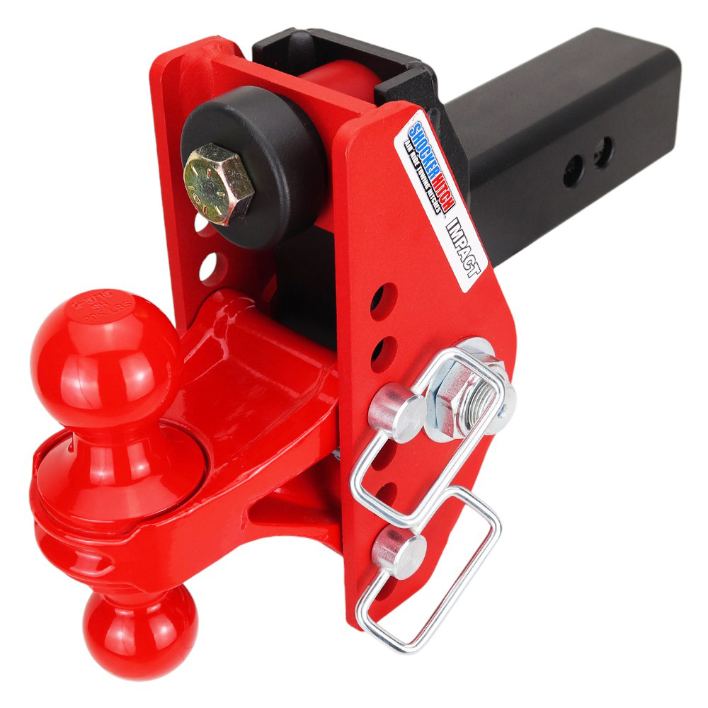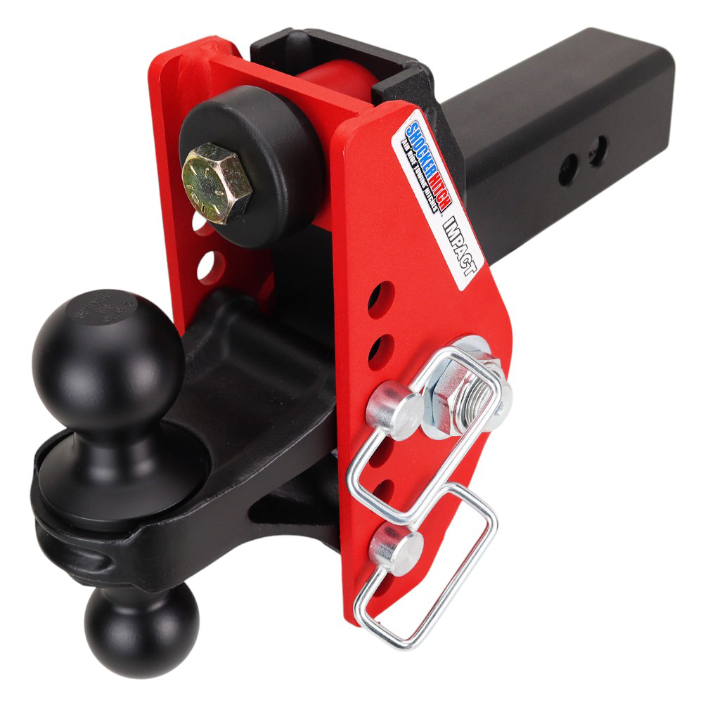 The Shocker Impact cushion hitch with adjustable combo ball mount is designed for heavy duty to cushion the towing experience and create a smooth ride. Great for contractors, boat owners, enclosed trailers, campers, car trailers, and even motorhomes. The pivoting, shock-absorbing dual-bump cushioning design is heavy duty and can handle the rough roads and give you a smooth tow. The bumps and bangs are filtered through the double cushions, and the unique flip-around design allows you to flip the entire hitch around for more drop or rise. The adjustable combo multi-ball mount has both a 2″ hitch ball and a 2-5/16″ hitch ball. This shocker absorbing combo hitch gives you 4″ of rise to 4″ of drop. Combo ball mount offers versatility for towing trailers with 2″ or 2-5/16″ ball couplers and features a safety red impact resistant textured durable powder coat finish. Shocker Impact cushioned hitch ball mount provides the ultimate in versatility and a smoother towing experience than a solid ball mount. The Impact ball mount has built in adjustability and maximum versatility with 7 adjustment holes for your towing needs. Works great on work vans, adventure vans, motorhomes, RVs, pickup trucks, full-size vans, SUVs, CUVs, and minivans. 2 hitch pin holes to adjust the length, and there is plenty of room on the receiver shank to accommodate hitch mounted towing mud flaps or shocker bumper tow flaps. Use this adjustable ball mount however you need to for tons of versatility. This Shocker Impact cushioned combo ball mount attaches by sliding into a standard receiver tube. 14,000 lbs tow rating capacity and 1,400 lbs tongue weight. Available with 2″ or 2.5″ receiver hitch shank.