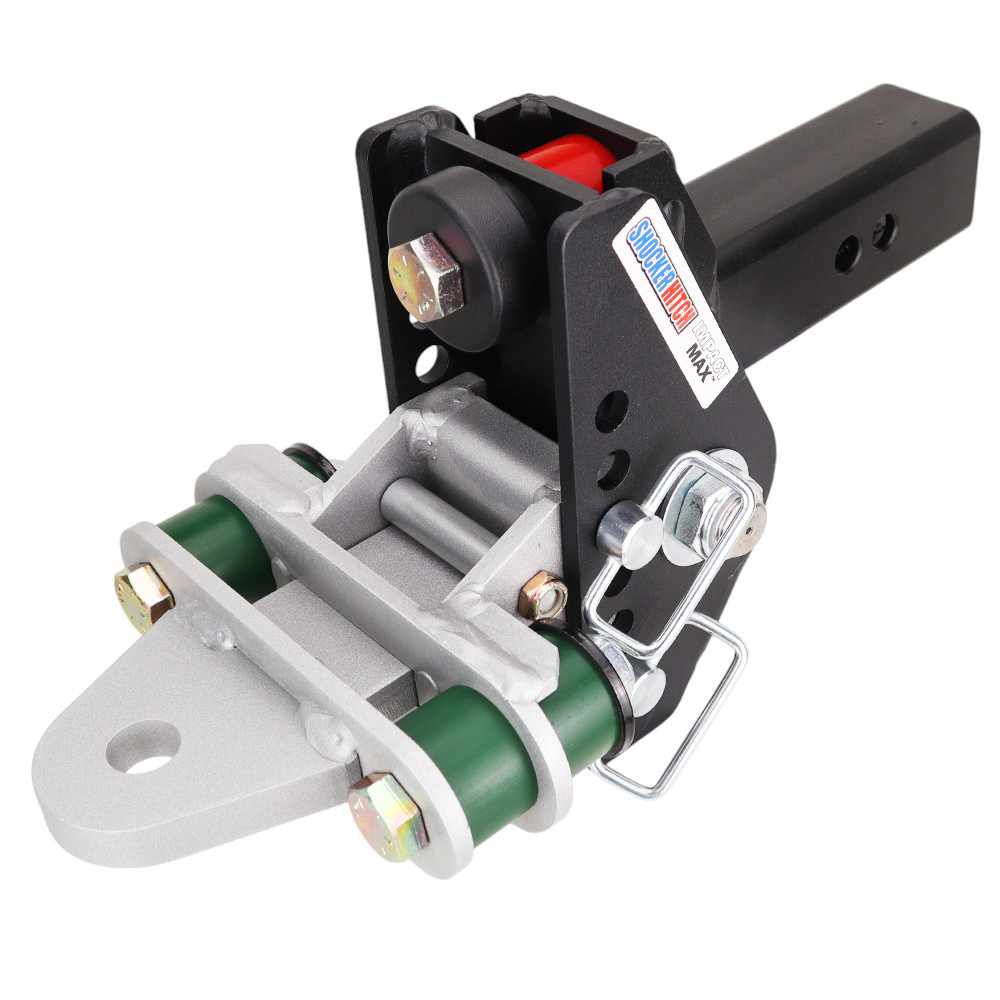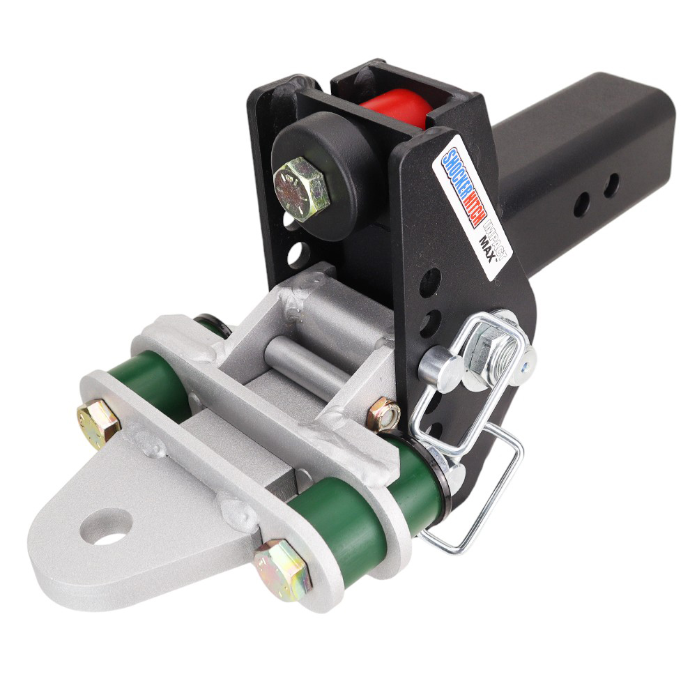- Includes complete adjustable Shocker Impact Max cushion hitch with built-in dual bump cushions, adjustable cushion drawbar mount attachment with 1″ hole plus 4 bump cushions & 2 d-handle drawbar attachment pins with clips.