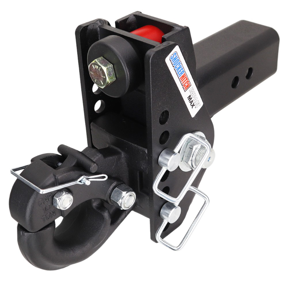 - Cushion Pintle Hitch Kit Includes: Complete adjustable Shocker Impact Max cushion hitch with built in dual bump cushions, adjustable pintle hook & 2 d-handle 5/8″ ball mount attachment pins with clips.