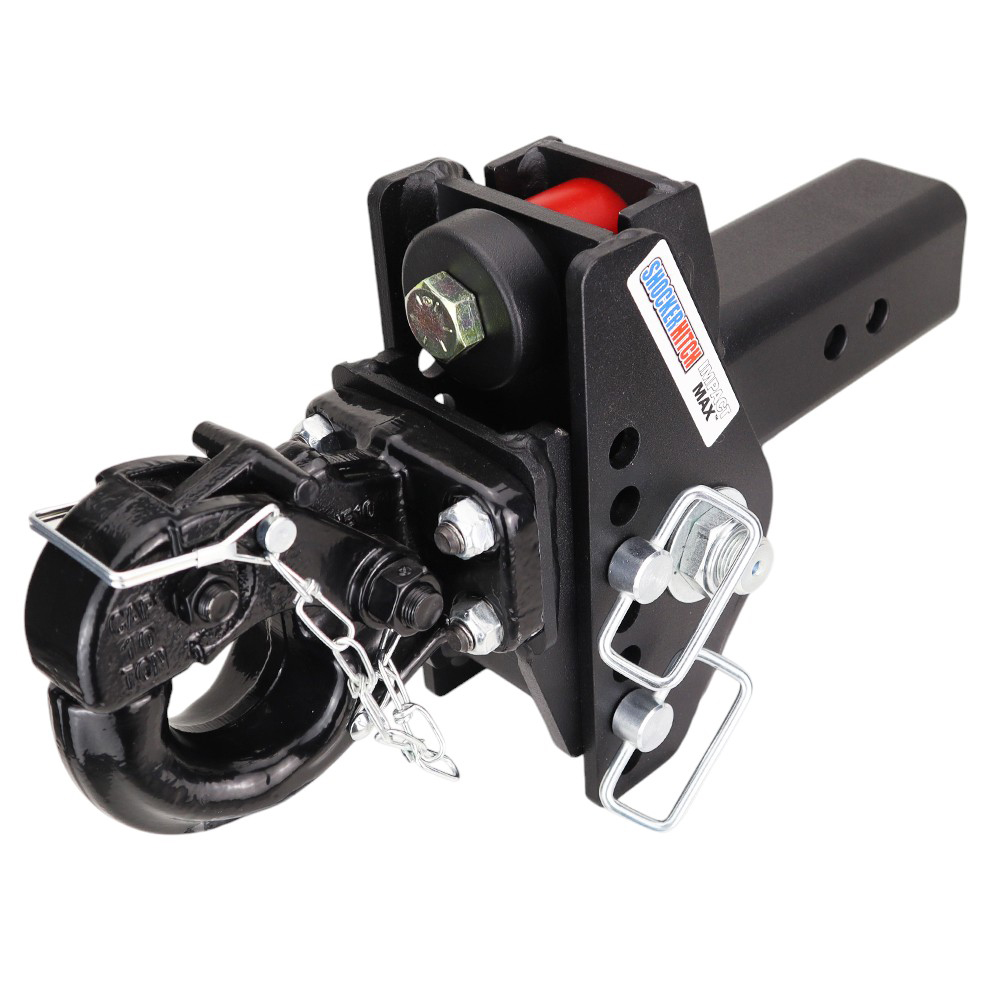 This 20K heavy-duty adjustable, dual cushion shock absorbing adjustable pintle hitch is great for farm, contractor and heavy duty trailer towing applications. The cushion hitch features a shock absorbing pivoting design that absorbs the bumps, bangs, jerks and tugs normally experienced when towing trailers with a pintle ring and creates smoother trailer towing. It’s idea on pickups pulling dump, skid steer, equipment and military trailers with a pintle ring on the front. Featuring over 10 inches of adjustment. Adjustable pintle hook has either 1″ Rise to 6-1/2″ drop or 4″ Rise to 6-1/2″ Drop. The all black Shocker Impact Max™ cushioning pintle hook ball mount is designed to absorb road shock and cushion your trailer towing experience. This hitch can be flipped around for more drop or rise. The dual bump cushion design pintle hitch is rated up to 20,000 lbs towing and 2,000 lbs tongue weight and also includes a 10-ton pintle hook. Featuring a heavy-duty pintle hook to fit a 6″ OD x 3″ ID pintle ring. Plus the shocker pintle hook hitch is designed and made for a nice, tight fit with your pintle ring. This Impact Max cushioned pintle hitch ball mount attaches to your truck by sliding into a standard receiver tube. Available for 2″, 2-1/2″ or 3″ receiver. Use this adjustable pintle hitch ball mount however you need to for tons of versatility. This military style HD towing hitch is great for contractors pulling skid steer, dump and tilt trailers, around the farm and off-road overland towing as well as other heavy-duty trailer towing applications. Built-in dual bump cushions, absorbing both the up or down & forward or backward jerks and tugs you experience towing creating a smoother towing experience. Made by Shocker Hitch® USA