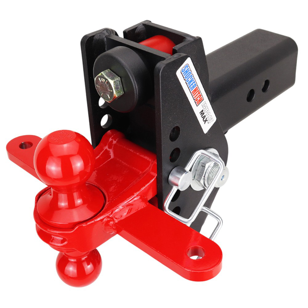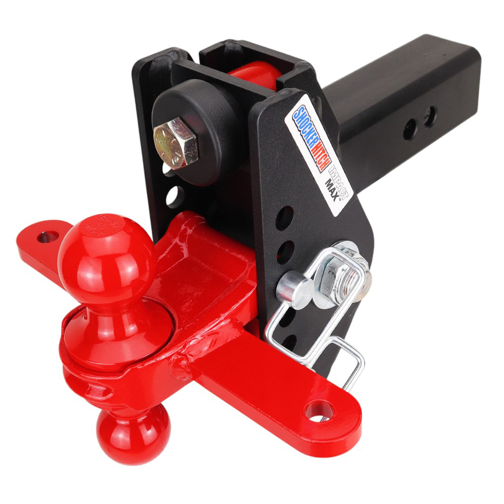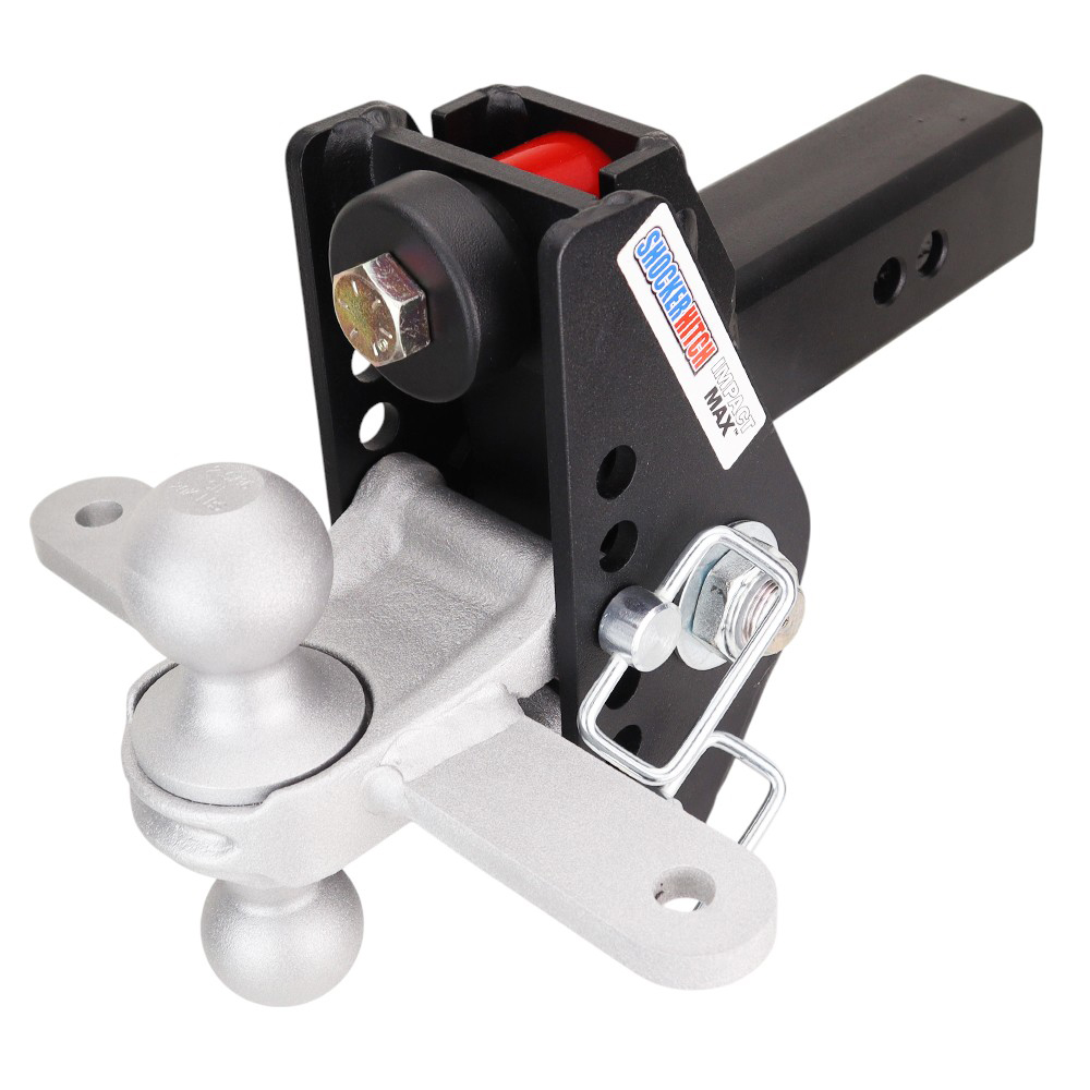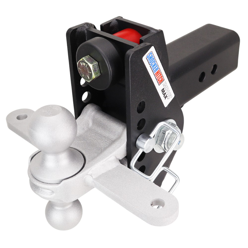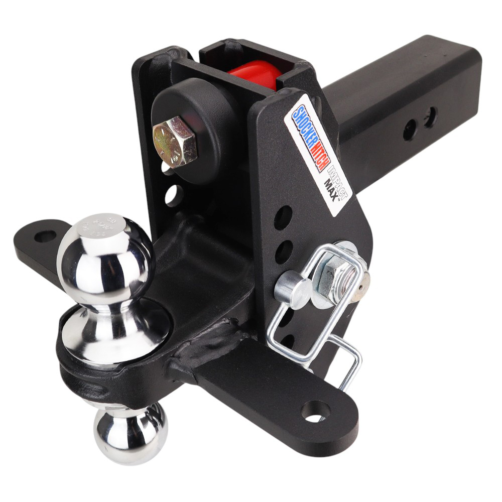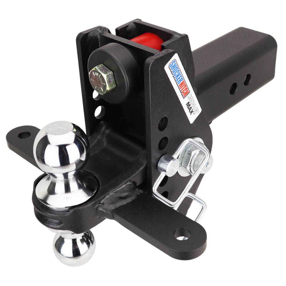 The Shocker Impact Max Black cushioned hitch ball mount with sway bar tabs is designed to cushion the towing experience and handle the road shock. Use this trailer towing hitch with friction sway bars. This shock absorbing cushion hitch ball mount is often considered the ideal boat towing and camper trailer towing hitch. The 20k dual heavy-duty bump cushion design is rated up to 20,000 lbs. Featuring a combo multi-ball mount with both a 2″ hitch ball and a 2-5/16″ hitch ball with 7 adjustment holes for 8″ of adjustment giving you 4″ of rise to 4″ of drop. Shocker Impact Max cushioned hitch ball mount with sway bar tabs provides the ultimate in versatility and a smoother towing experience than a solid ball mount. Ideal for absorbing the road shock when you are towing up to 20,000 lb trailers; boat, skid steer, dump, cargo, snowmobile, fishhouse, campers and more. The Impact Max cushion style ball mount has built in adjustment for maximum versatility with 7 adjustment holes for your towing needs. This Shocker Impact Max cushioned combo ball mount attaches by sliding into a standard receiver tube. Use this adjustable cushioned ball mount however you need to for tons of versatility. The Impact max comes with impact resistant super durable textured matte black powder coated finish on the base frame for long-lasting life and sleek finish. If you are looking for a Shocker Hitch for an SUV, this is it. Works great on pickup trucks, vans, suvs, cuvs, minivans & motorhomes. up to 20,000 lbs tow rating capacity and 2,000 lbs tongue weight. Chrome, black, red or silver cmbo ball mount with a premium finish. Since it has 2 hitch pin holes, it also works with hitch mounted towing mud flaps. Made by Shocker Hitch® USA