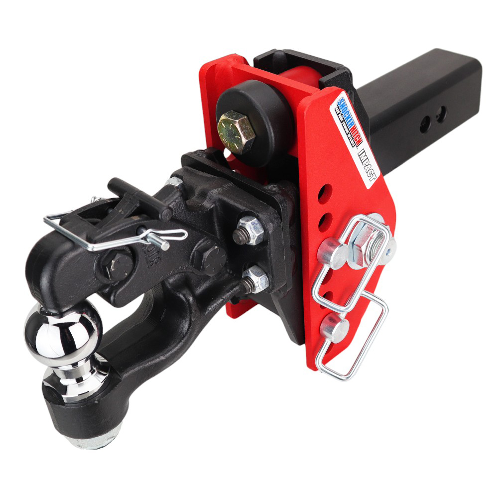 Adjustable ball and pintle hitch with a road shock absorbing design to cushion your pintle trailer towing. The exclusive dual cushion design absorbs the tugs, jerks, bumps, and bangs felt when towing with both front and rear cushions on a pivoting frame. This makes trailer towing easier on you, your equipment and whatever you are hauling. The Shocker Impact red adjustable cushion hitch with a pintle hook with ball attachment offers 4″ rise to 6-1/2″ of drop with a flip around design, where the entire hitch frame can be flipped around for more drop or rise. Featuring 14,000 lbs tow rating capacity and 1,400 lbs tongue weight. Shocker Impact pintle ball hook mount provides the ultimate versatility, choose from a 2″ ball or a 2-5/15″ ball. The Impact comes with impact resistant super-durable safety red powder-coated finish on the base frame for long-lasting life and a sleek finish. The Impact Max black is adjustable for maximum versatility for whatever your towing needs are. This Shocker red Impact pintle hook ball mount attaches by sliding into a standard receiver tube. Available with 2″ or 2.5″ receiver hitch shank. Use this adjustable ball mount hitch however you need to for tons of versatility. This pintle hook fits 6″ OD x 2-1/2″ to 3″ ID pintle rings. This military-style hitch is still popular for many towing applications.
