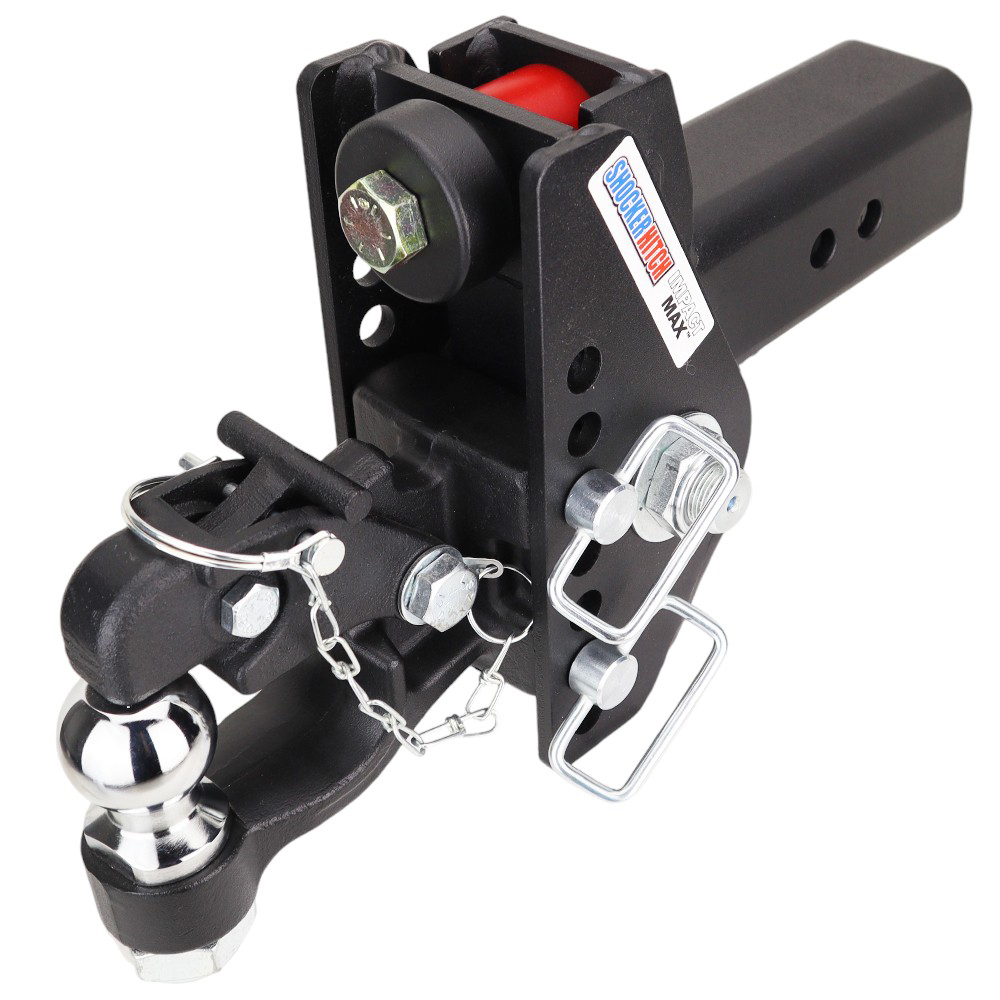 The Shocker Impact Black Max Cushion hitch with Channel Pintle Hook and Ball is designed up to 8-ton of towing capacity. It features an adjustable drop range from 1″ rise to 6-1/2″ of drop, providing maximum versatility for various towing setups. Pintle & ball attachment options include a 2″ ball with a 10,000 lb towing capacity or a 2-5/16″ ball with a 16,000 lb towing capacity. The pintle hook is compatible with 6″ OD x 3″ ID pintle rings, making it suitable for a wide range of trailers, including those with military-style hitches.