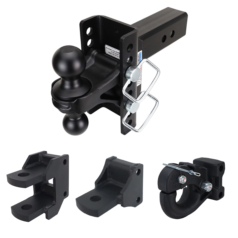 Get the most versatile adjustable channel style drop hitch kit for around the farm. The XR series farm mount towing package lets you hook up and tow everything around the farm. The Shocker XR hitch and Farm Mount kit provides every mount you need, including combo ball, pintle, drawbar and clevis pin to hook up to farm equipment, cultivators, fertilizer spreaders, bailers, augers, sprayers, and other agriculture-related equipment, trailers, and more. Choose either the 8-hole or 10-hole channel XR ball mount frame comes with a premium powder-coated black finish for long-lasting life and sleek finish. Get tons of versatility with quick wagon or trailer hookup and disconnect. This farm towing kit includes a black combo ball mount for standard trailers, a clevis pin mount, an adjustable pintle hook, and a standard drawbar attachment. The HD channel design is rated up to 20,000 lbs towing capacity depending on shank size. The 8-hole channel option offers an 8″ of height adjustment range from 4″ of rise to 7″ of drop that can be flipped for additional rise or drop and 10 hole channel offers an extra 1.5″ of drop and rise.