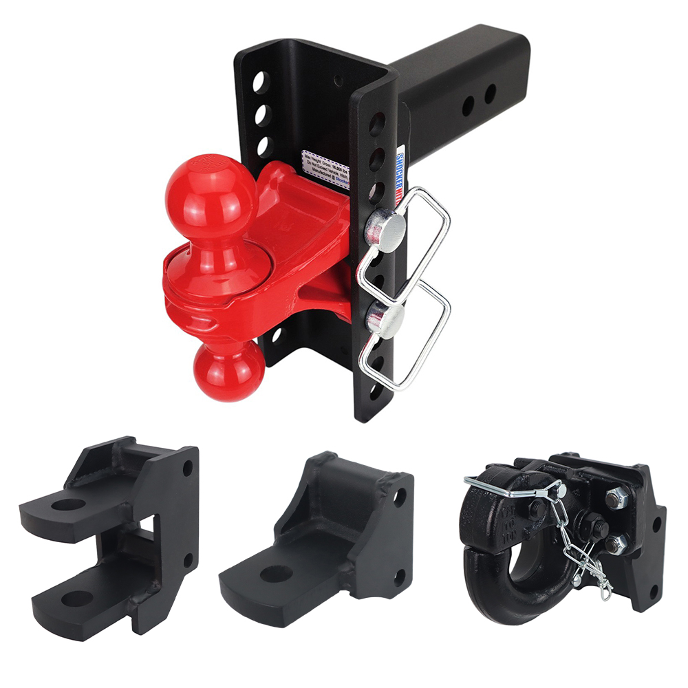 Get the most versatile adjustable channel style drop hitch kit for around the farm. The XR series farm mount towing package lets you hook up and tow everything around the farm. The Shocker XR hitch and Farm Mount kit provides every mount you need, including combo ball, pintle, drawbar and clevis pin to hook up to farm equipment, cultivators, fertilizer spreaders, bailers, augers, sprayers, and other agriculture-related equipment, trailers, and more. Choose either the 8-hole or 10-hole channel XR ball mount frame comes with a premium powder-coated black finish for long-lasting life and sleek finish. Get tons of versatility with quick wagon or trailer hookup and disconnect. This farm towing kit includes a black combo ball mount for standard trailers, a clevis pin mount, an adjustable pintle hook, and a standard drawbar attachment. The HD channel design is rated up to 20,000 lbs towing capacity depending on shank size. The 8-hole channel option offers an 8″ of height adjustment range from 4″ of rise to 6-1/2″ of drop that can be flipped for additional rise or drop and 10 hole channel offers an extra 1.5″ of drop and rise.