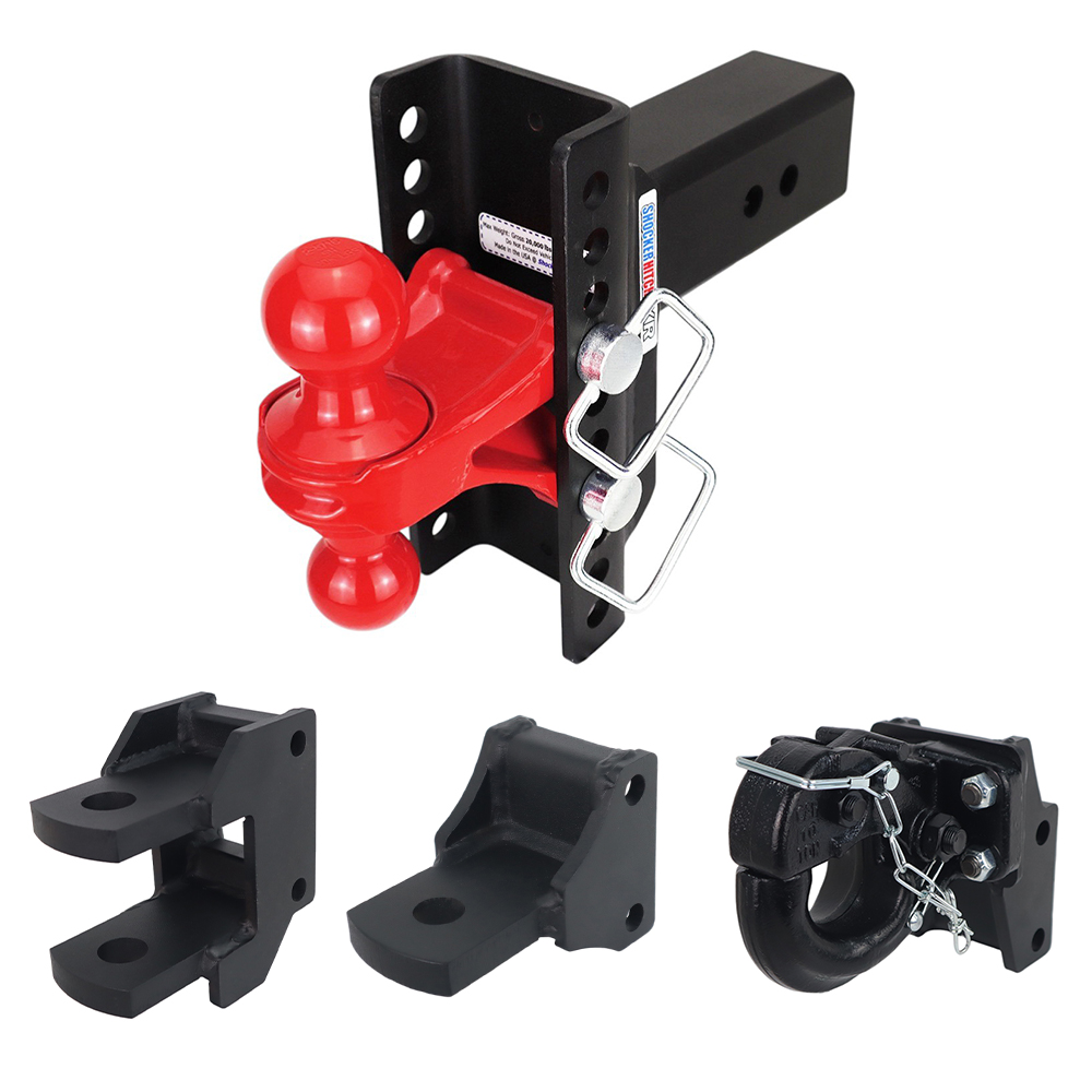 - Farm Tow Kit Includes complete adjustable Shocker XR channel hitch, adjustable combo dual ball mount with 2″ & 2-5/16″ hitch balls, clevis mount, adjustable pintle mount, drawbar & 2 ball mount attachment pins with clips.