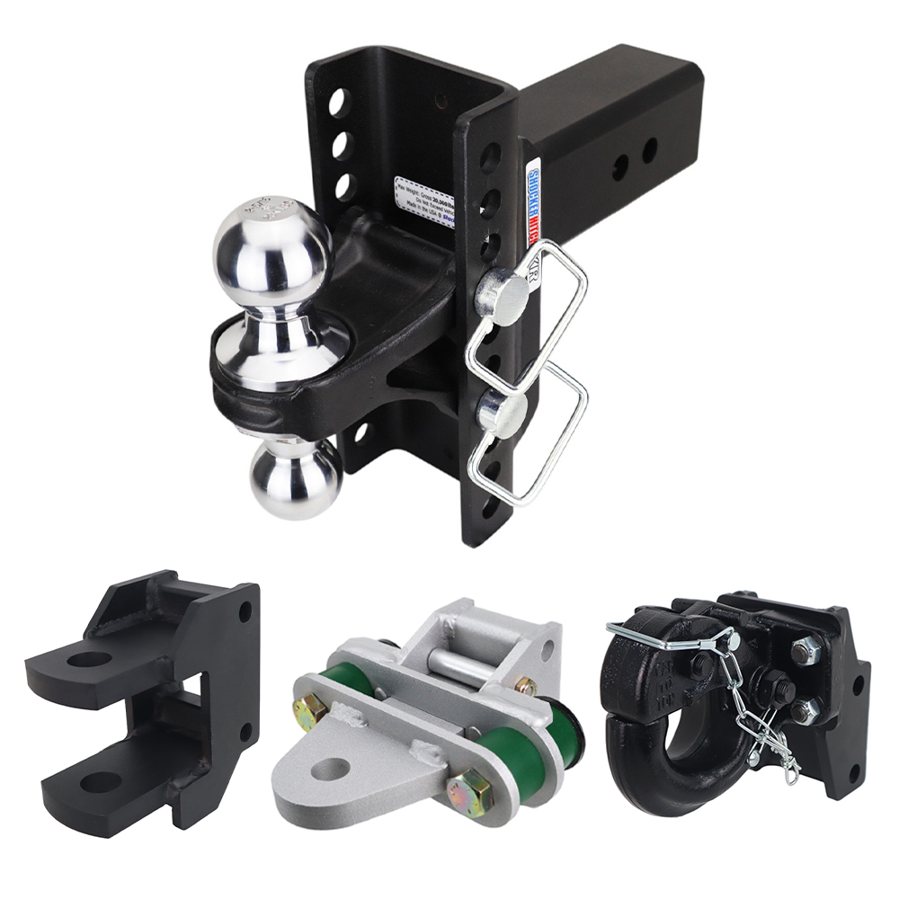 - Combo Ball: Combo adjustable multi-ball mount has 2″ hitch ball & 2 5/16″ hitch ball with 4″ rise to 4″ drop. (2-5/16″ ball is rated at 20,000 lbs & 2″ ball is rated at 10,000 lbs.) (Add 2″ Drop/Rise for 10 Hole Frame)