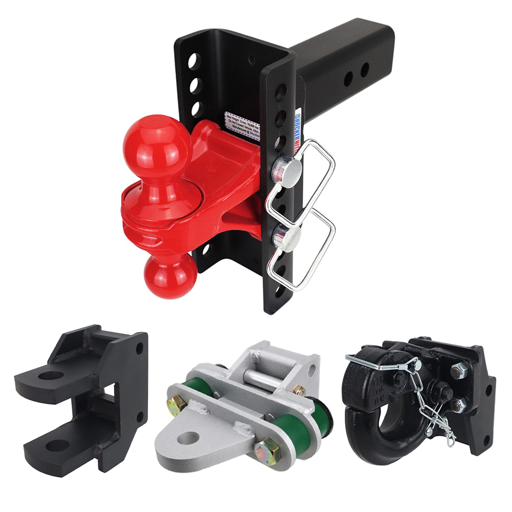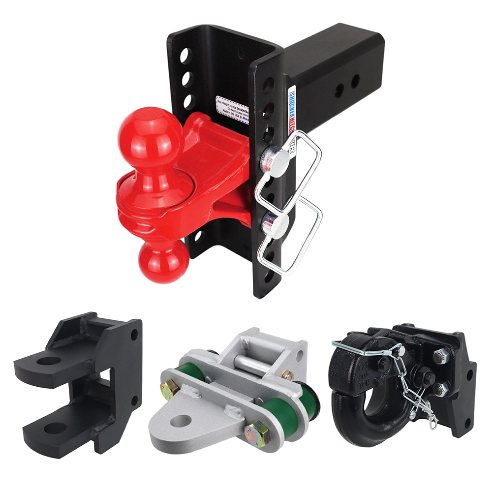 The deluxe farm tow hitch package has everything you need for the farm or ranch for quick hookup and detach from a variety of trailers, wagons and equipment. Includes 4 cushion drawbar, clevis, combo ball and pintle hook. The channel style drop hitch can be flipped around for more drop or rise. Get the most versatile adjustable ball mount hitch farm towing package to fit every need around the farm. The Shocker XR hitch and Farm Mount kit provides every mount you need to hook up to farm equipment, cultivators, fertilizer spreaders, bailers, augers, sprayers, and other agriculture-related equipment, trailers, and more. Choose either the 8 hole or 10 hole channel XR ball mount frame comes with a premium powder-coated black finish for long-lasting life and sleek finish. Get tons of versatility with quick wagon or trailer hookup and disconnect. This farm towing kit includes a combo ball mount for standard trailers, a clevis pin mount, an adjustable pintle hook, and a quad-cushion drawbar attachment. The HD channel design is rated up to 20,000 lbs towing capacity depending on shank size. The 8-hole channel option offers 8″ of height adjustment range from 4″ of rise to 6-1/2″ of drop that can be flipped for additional rise or drop and 10-hole channel offers an extra 1.5″ of drop and rise.