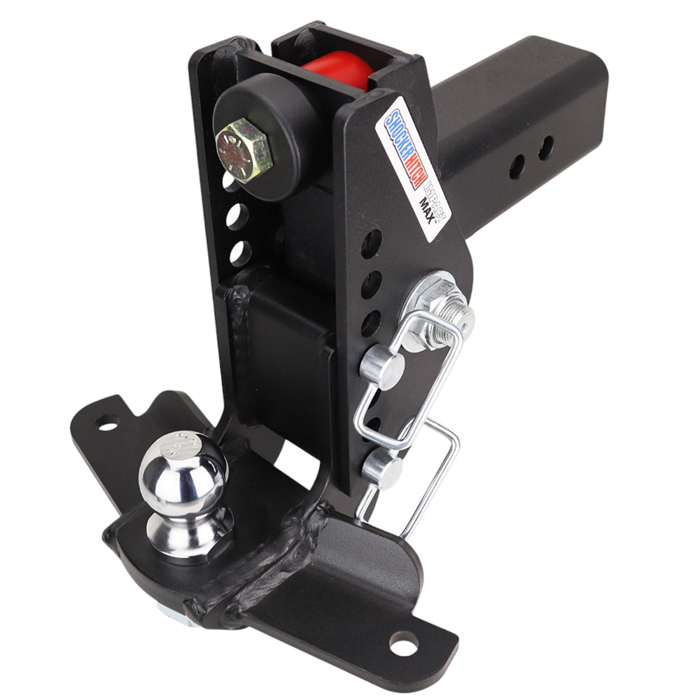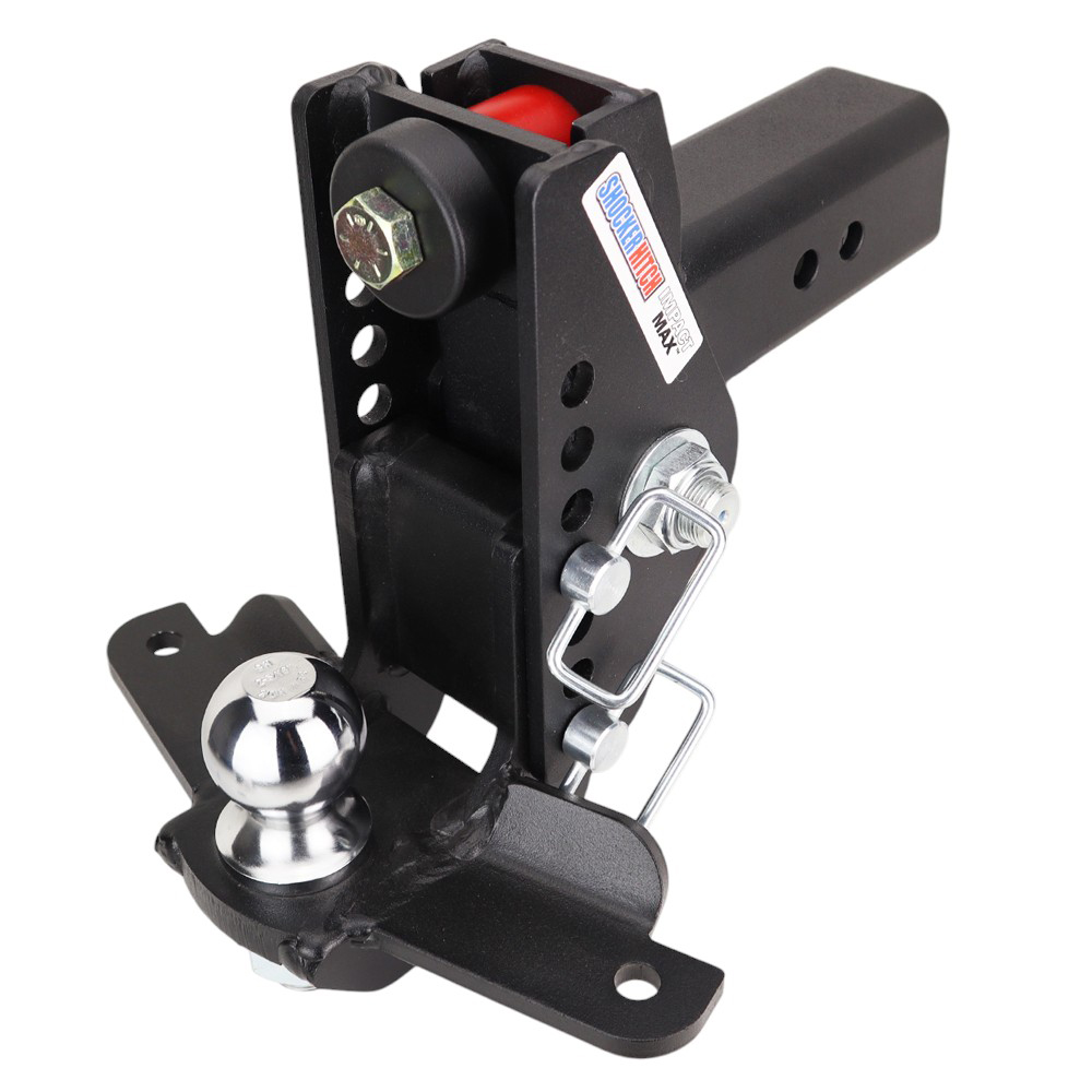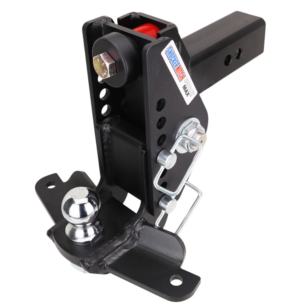 The ultimate heavy duty sway control cushioning drop hitch for taller or lifted pickup trucks. Matte Black 20,000 lbs GTW Impact Max Shocker drop cushion hitch features sway bar mounting tabs. Plus it has a dual bump cushion design for cushioning and absorbing the road shock, bumps, bangs, jerks and tugs select when towing a trailer. The Impact Max drop cushion bumper hitch features 7 adjustment holes for up to 7-1/2″ of drop which is great for taller lifted pickup trucks and suvs. The entire hitch frame can be flipped around for more drop or rise, making it very versatile. The Shocker Impact Max cushioned drop ball mount comes with either a 2″ or 2-5/16″ hitch ball is designed for towing a variety of trailers including skid steer equipment trailers, boat trailers, fish & ice house, race trailers, cargo trailers, campers and more. The Impact max comes with impact resistant super durable textured matte black powder coated finish on the base frame for long-lasting life and sleek finish. It cushions your towing experience with the built-in dual bump cushions, absorbing both the up/down & forward/backward jerks and tugs you experience towing. This HD cushion hitch is rated at 20,000 lbs towing capacity & 2,000 lbs tongue weight featuring 0″ to 7-1/2″ of drop. The 20,000 lbs tow rating capacity and 2,000 lbs tongue weight means it can handle to heaviest of loads. Works great on pickup trucks, vans, suvs that are higher than stock. Shocker black Impact series cushioning drop hitch with sway bar tabs provides the ultimate in versatility and a smoother towing experience than a traditional solid ball mount. This Shocker drop Impact Max cushioned ball mount attaches by sliding into a standard 2″, 2-1/2″ or 3″ receiver tube. It also features 2 hitch pin holes to adjust the length and there is plenty of room on the receiver shank to accommodate hitch-mounted towing mud flaps like the Shocker Hitch Tow Flaps and more. Made by Shocker Hitch® USA